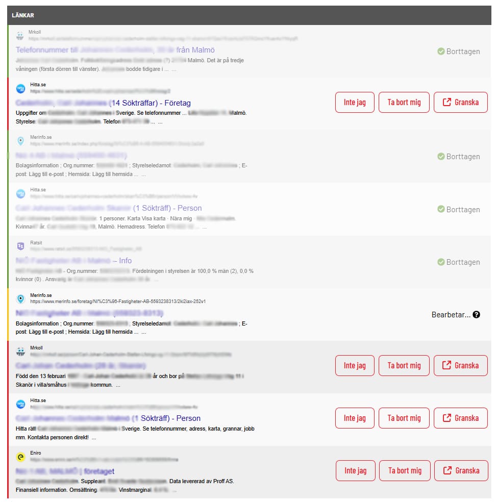 - Din personliga översikt på “Mina sidor”: Alla länkar som systemet hittar samlas på ett och samma ställe i din portal. Här får du en tydlig lista över var information som potentiellt handlar om dig finns indexerad av Google.